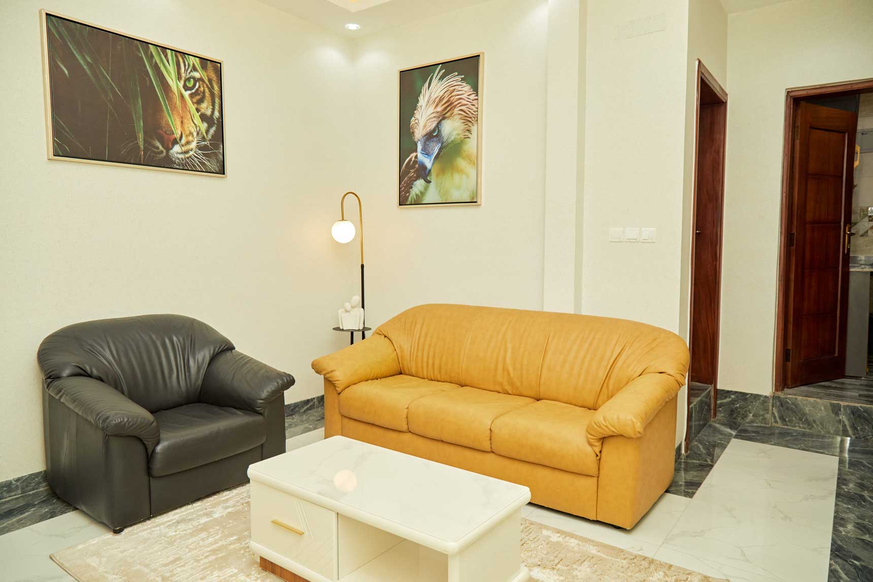 • Un appartement de luxe situé au rez de chausse ayant une chambre avec salle de bain, un salon, une cuisine, un balcon et une toilette moderne pour visiteur, une connexion internet à haut début.